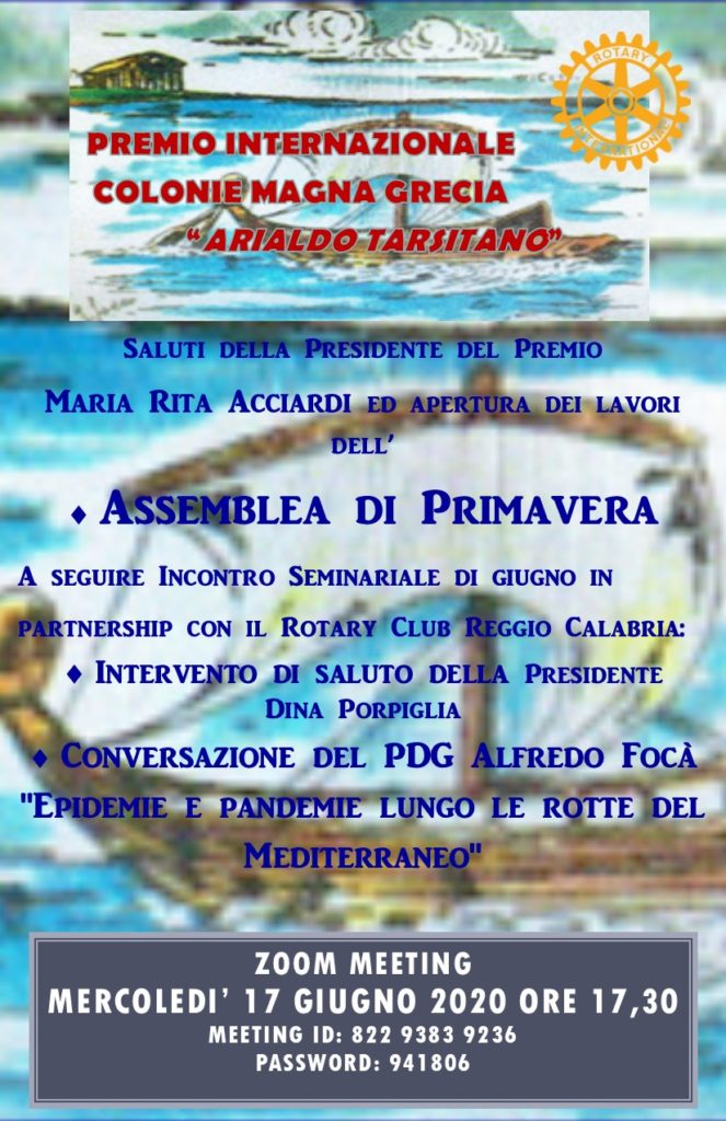 (Rotary) – Lamezia Terme, 17 giugno 2020 – L’assemblea di Primavera quest’anno si è svolta in videoconferenza. Ad aprire i lavori è stato il Presidente del Premio Internazionale Colonie Magna Grecia “Arialdo Tarsitano”. Dopo i saluti del Presidente è seguito l’incontro seminariale di giugno in partnership con il Rotary Club Reggio Calabria, che ha visto gli interventi della Presidente del club Dina Porpiglia e la conversazione del PD Alfredo Focà sul tema “Epidemie e pandemie lungo le rotte del Mediterraneo”.